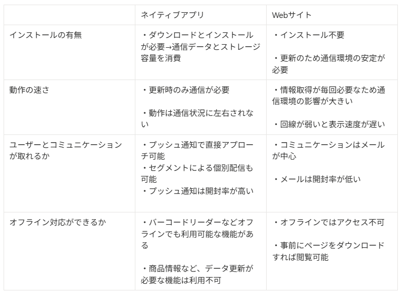 ここまで、ネイティブアプリとWebサイトの違いを説明しましたが、改めてそれぞれの違いを簡単にまとめると以下のようになります。自社に適したものを選ぶ際にご参考ください。