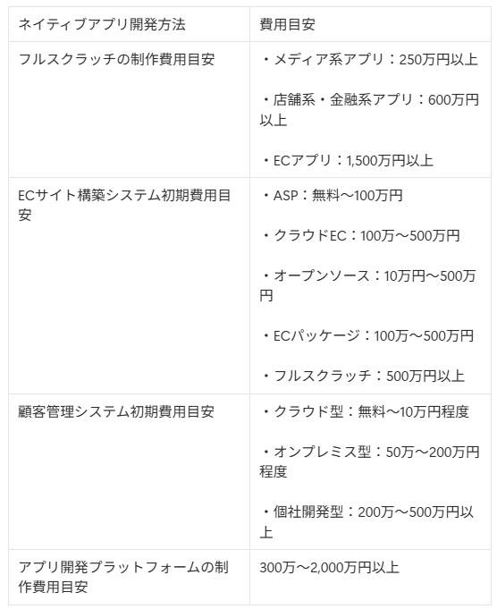 ネイティブアプリを制作する費用の目安を表にすると、以下のとおりです。