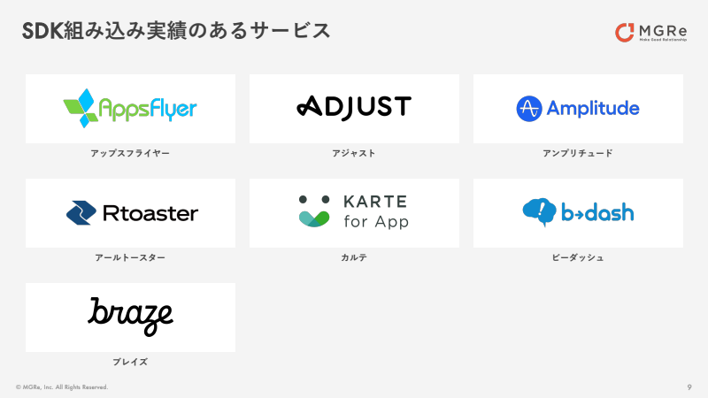 MGReでは、「AppsFlyer」や「Adjust」以外にも様々なSDK組み込みが可能です。