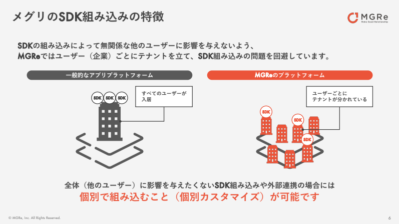 多くのアプリプラットフォームでは、SDKを追加すると全体の仕組みに影響が出やすく、個別企業向けの対応はむずかしいのが一般的です。MGReは企業ごとに専用のテナントを用意して管理するため、特定の企業だけが利用したい外部サービスやSDKを、安全に組み込めます。