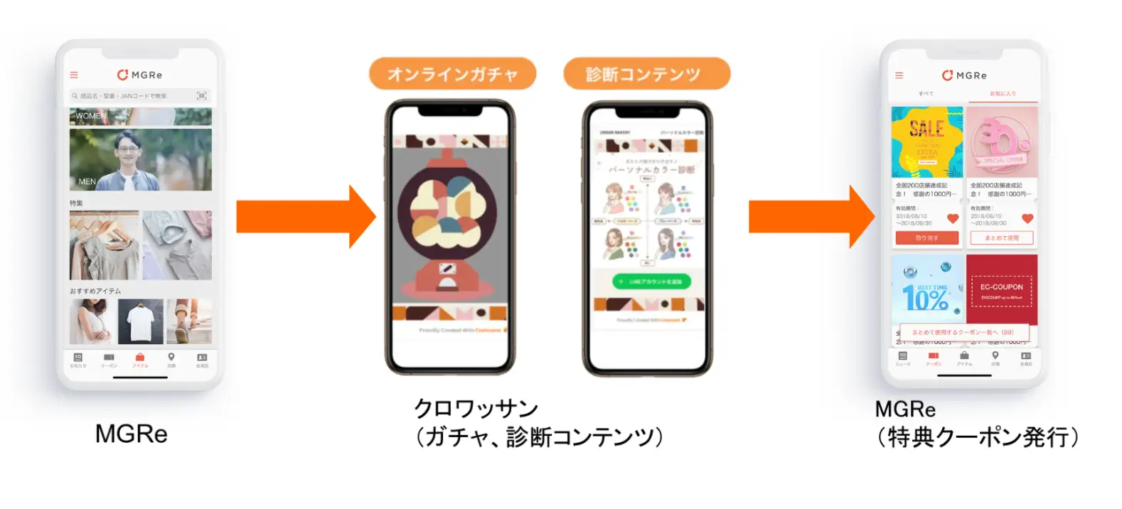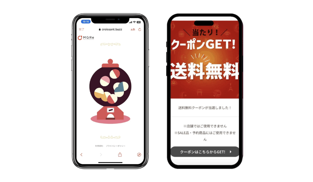 具体的には、MGReが提供するアプリにクロワッサンで生成したオンラインガチャや診断コンテンツを掲載し、ガチャや診断の結果に応じてユーザーにクーポンなどを提供する仕組みです。クーポンの発行は、MGReの機能を使って行います。
