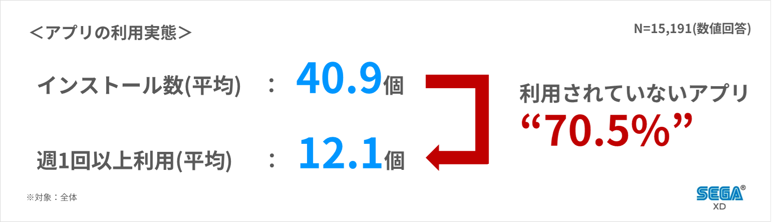 多くのスマホアプリは、インストールされても起動されないことがほとんどです。セガXDの調査では、スマホには平均40個以上のアプリがインストールされているのに、週1回以上利用されるのは約3割だけという結果が出ています。