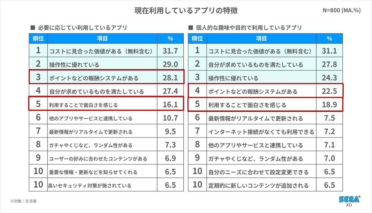ユーザーに積極的に利用されるアプリには共通点があります。セガXDの調査では、「ポイントがもらえる」「使っていて楽しい」と感じられることが重要という結果が出ています。ユーザーが明確なメリットや楽しさを実感できる仕組みを用意できれば、アプリの継続利用を促すことが可能です。